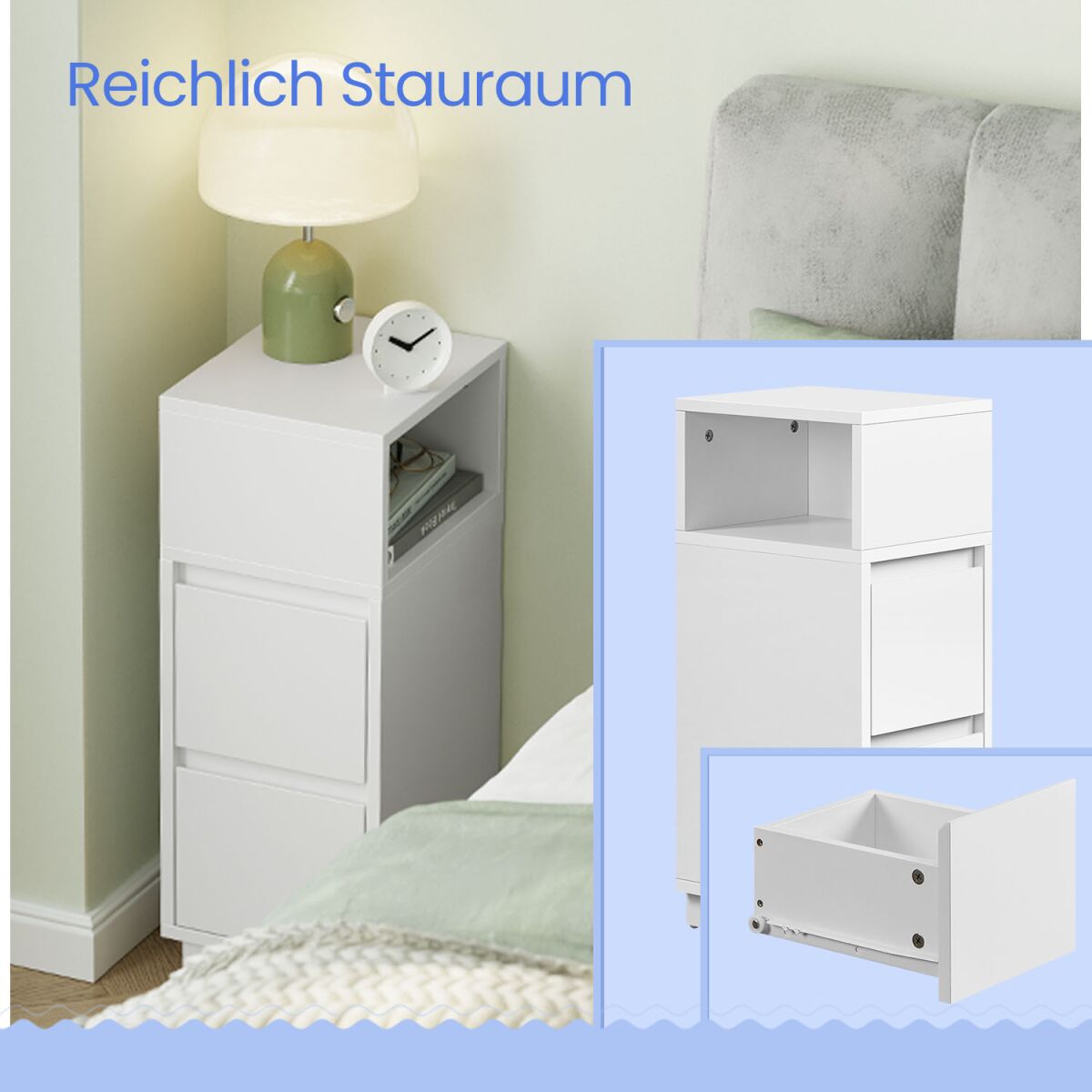 Too oma koju värskust selle kaheosalise kitsaste öökappide komplektiga pilvevalges toonis. Mõlemal kapil on kaks mahukat sahtlit ning paindlikult paigaldatav avatud riiul, kuhu saad panna igapäevased asjad. Valmistatud vastupidavast puitlaastplaadist ja MDF-st, mis tagab pika kasutusea. Kompaktne disain sobib hästi väikestesse magamistubadesse või elutuppa diivanilauaks. Hoia oma ruum korras ja stiilne nende kaasaegsete kappidega.